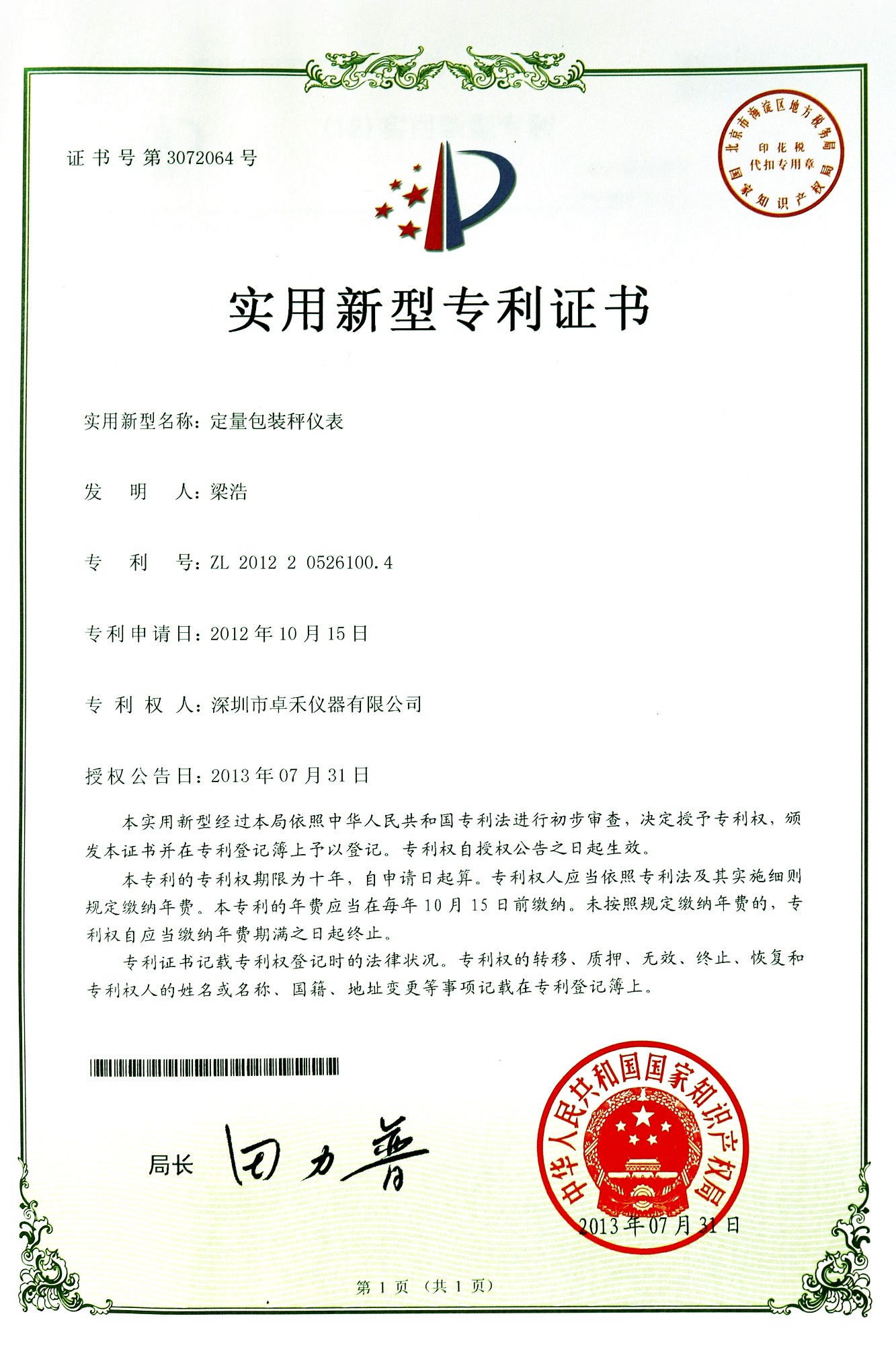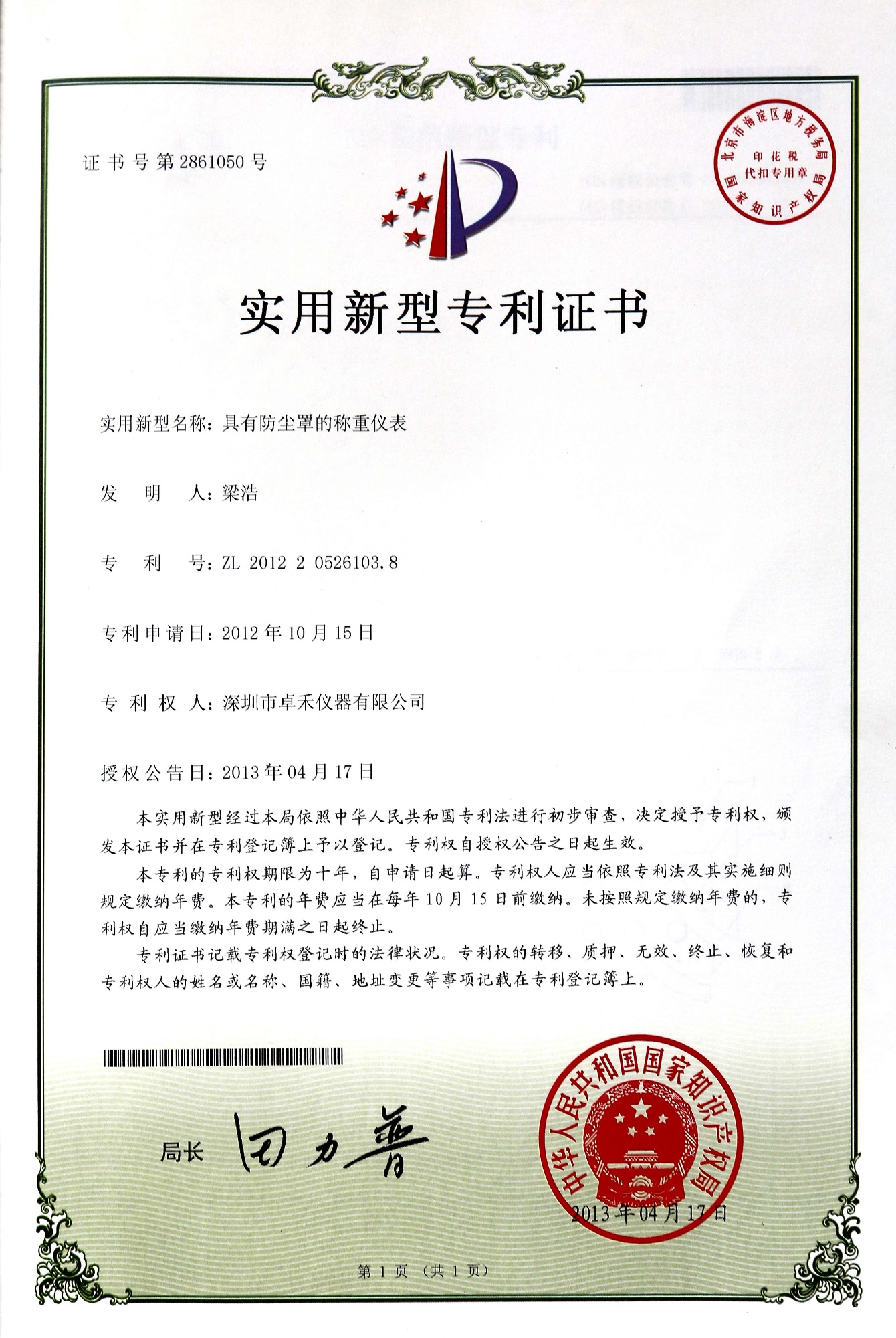 welcome欢迎光临威尼斯具有防尘罩的称重仪表专利证书