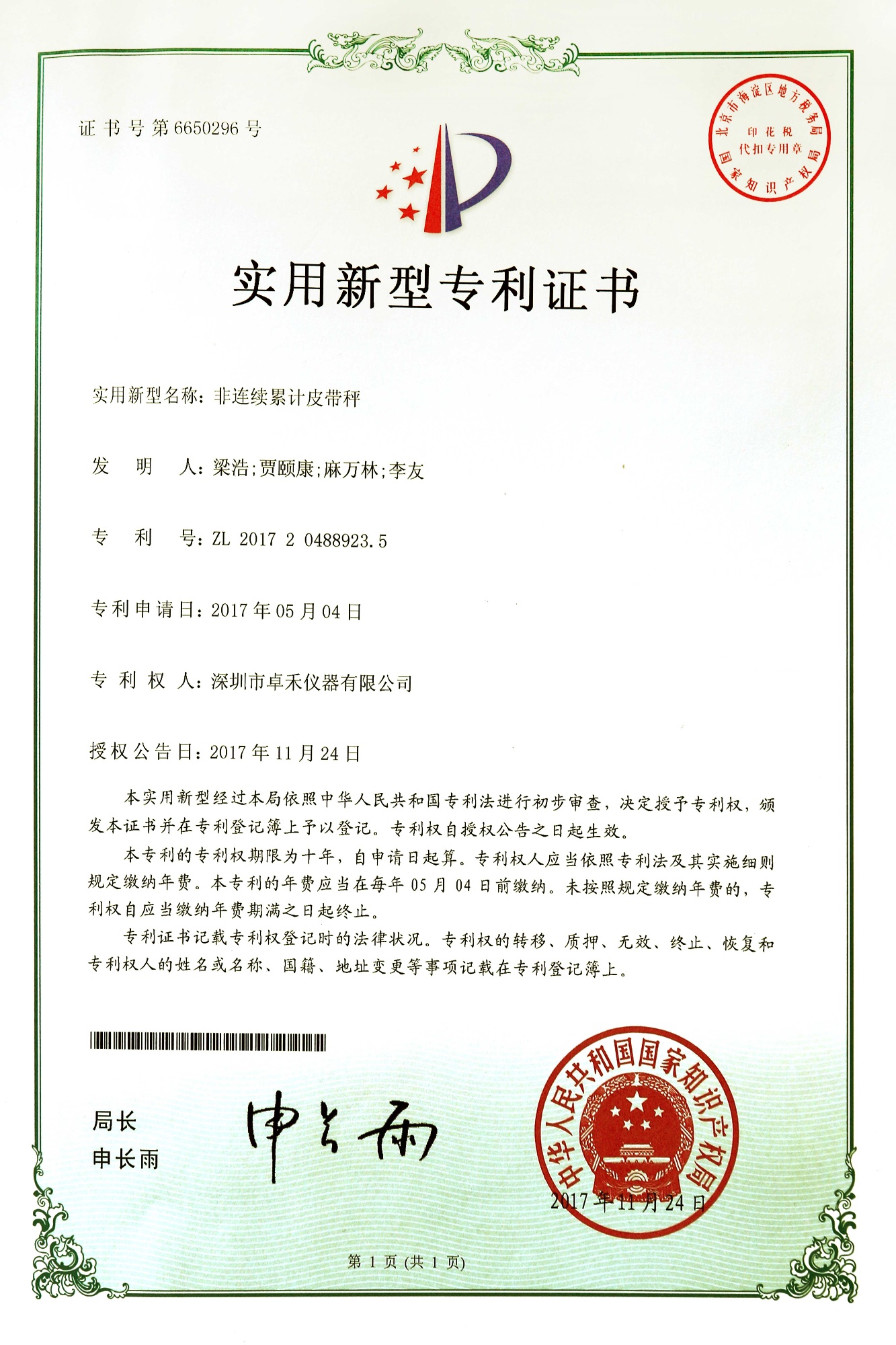 welcome欢迎光临威尼斯非连续累计皮带秤专利证书